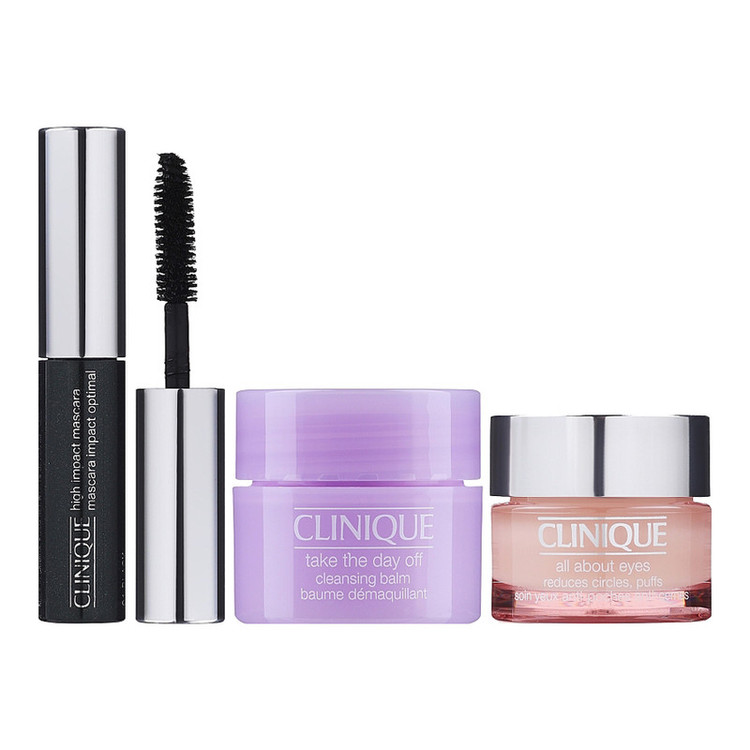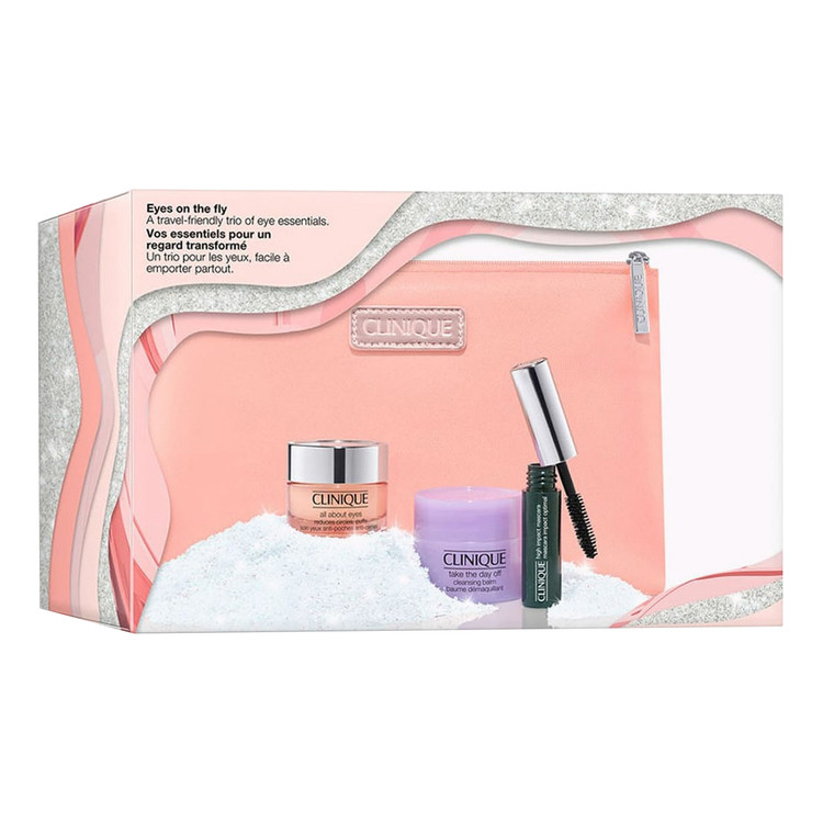 مجموعه مراقبت و آرایش چشم کلینیک مدل Eyes on the fly شامل یک ژل-کرم دور چشم فول سایز کلینیک مدل all about eyes است که 15 میلی لیتر حجم دارد. این کرم دایره سیاهی دور چشم و پف آن را از بین میبرد. این محصول به سرعت جذب می شود و آرایش را به خوبی نگه می دارد. محصول دوم در این مجموعه، پاک کننده ی آرایش کلینیک بالم مدل take the day off است که برای پاک کردن آرایش پلک، مژه ها و لب مناسب است. این پاک کننده 15 میلی لیتر حجم دارد. ریمل تراول سایز کلینیک مدل high impact mascara با حجم 3.5 میلی لیتر سومین محصول موجود در این مجموعه است. تمامی محصولات داخل کیف آرایشی کلینیک قرار دارند.