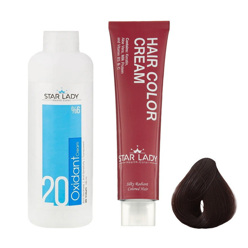 رنگ مو استارلیدی شماره 4.65 حجم 120 میلی لیتر رنگ قهوه ای شکلاتی به همراه اکسیدان استارلیدی مدل 20 شش درصدی حجم 180 میلی لیتر