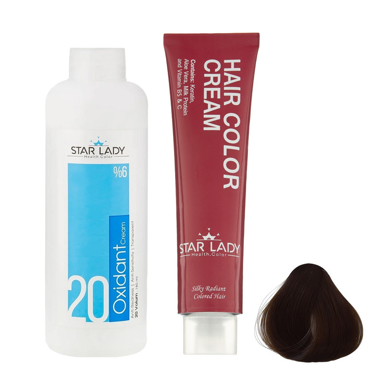 رنگ مو استارلیدی شماره 6.35 حجم 120 میلی لیتر رنگ بلوند تنباکویی تیره به همراه اکسیدان استارلیدی مدل 20 شش درصدی حجم 180 میلی لیتر