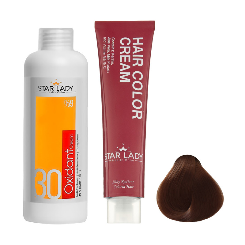 رنگ مو استارلیدی شماره 7.65 حجم 120 میلی لیتر رنگ بلوند شکلاتی به همراه اکسیدان استارلیدی مدل 30 نه درصدی حجم 180 میلی لیتر