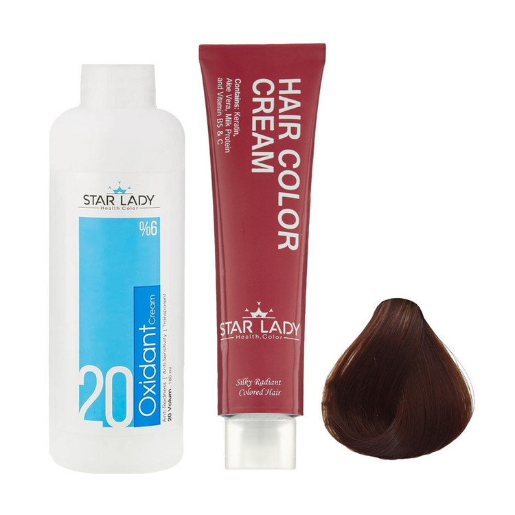 رنگ مو استارلیدی شماره 5.5 حجم 120 میلی لیتر رنگ قهوه ای طلایی روشن به همراه اکسیدان استارلیدی مدل 20 شش درصدی حجم 180 میلی لیتر