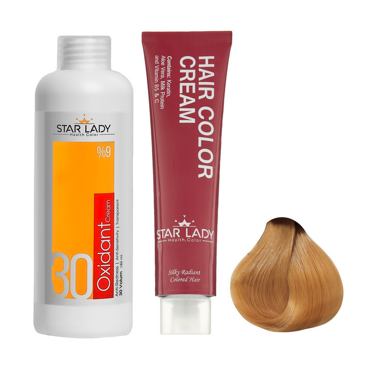 رنگ مو استارلیدی شماره 9.5 حجم 120 میلی لیتر رنگ بلوند طلایی خیلی روشن به همراه اکسیدان استارلیدی مدل 30 نه درصدی حجم 180 میلی لیتر