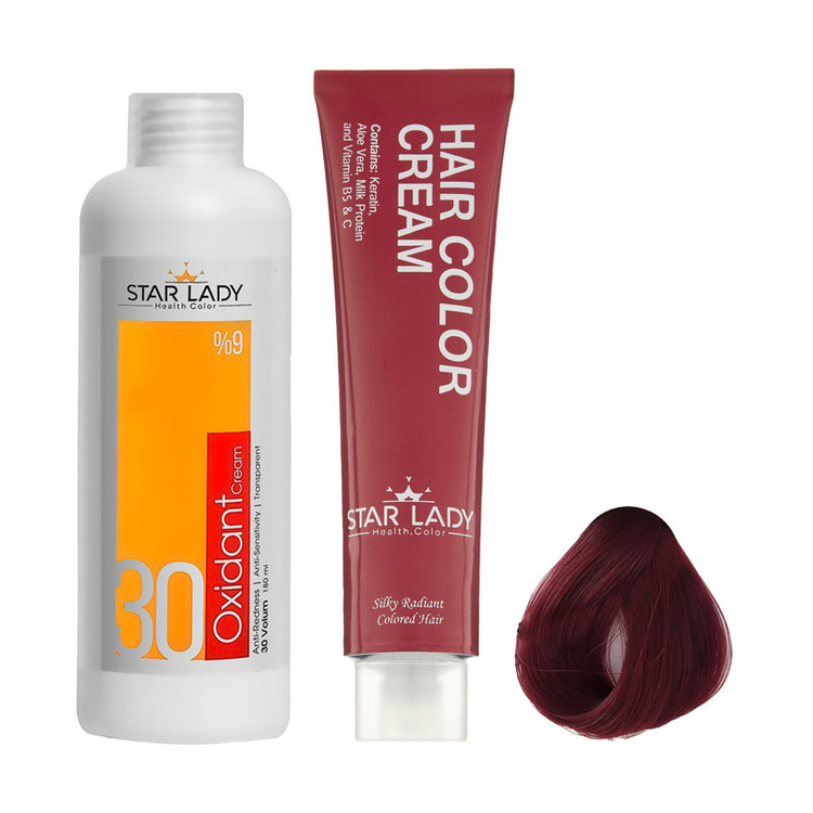 رنگ مو استارلیدی شماره 7.6 حجم 120 میلی لیتر رنگ ماهگونی روشن به همراه اکسیدان استارلیدی مدل 30 نه درصدی حجم 180 میلی لیتر