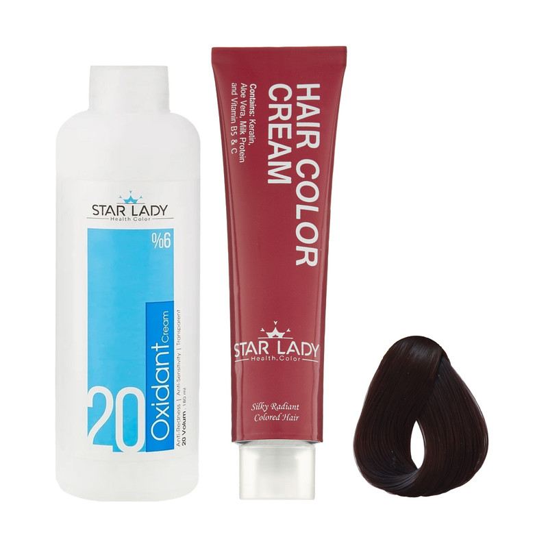 رنگ مو استارلیدی شماره 3.0 حجم 120 میلی لیتر رنگ قهوه ای تیره به همراه اکسیدان استارلیدی مدل 20 شش درصدی حجم 180 میلی لیتر