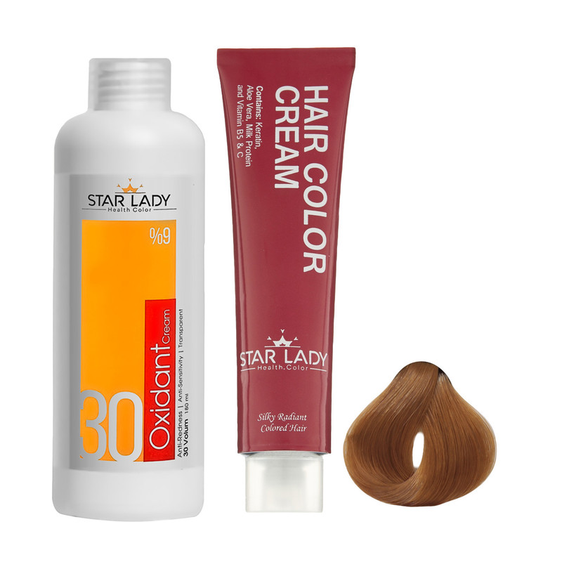 رنگ مو استارلیدی شماره 7.5 حجم 120 میلی لیتر رنگ بلوند طلایی به همراه اکسیدان استارلیدی مدل 30 نه درصدی حجم 180 میلی لیتر