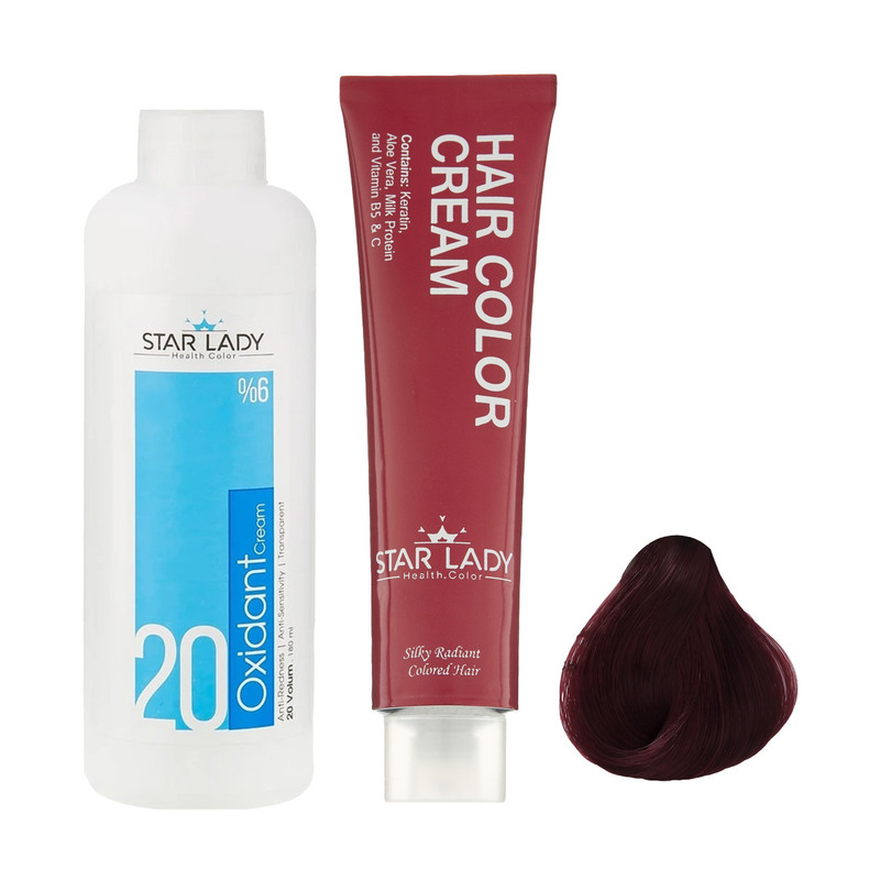 رنگ مو استارلیدی شماره 6.6 حجم 120 میلی لیتر رنگ ماهگونی متوسط به همراه اکسیدان استارلیدی مدل 20 شش درصدی حجم 180 میلی لیتر